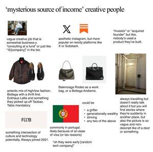 在W. David Marx的《地位與文化》結尾,他將我們當前的文化狀態描述為由「雜食者的品味」所定義。他說:「最精緻的衣櫥混合了復古的Givenchy和Uniqlo」。我認為這在這些「神秘收入來源」的人身上得以體現,他們因為加密貨幣、詐騙或才華而變得富有,但由於地位信號的崩潰,變得完全無法在階層中視覺上定位。這筆錢從哪裡來的?是世代財富嗎?是信用卡債務嗎?他們真的破產了嗎?沒有人知道!